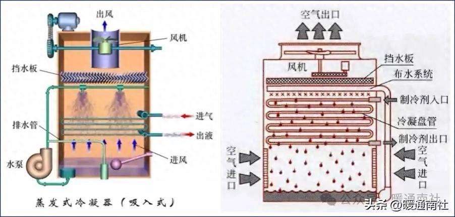 蒸发式冷凝器以水和空气作为冷却介质,它利用水的蒸发带走气态制冷剂的冷凝热。